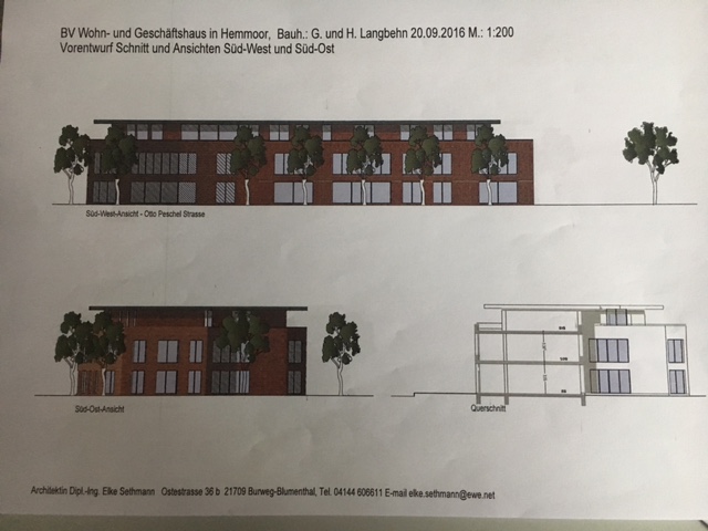 In der am 18.1.2017 stattgefundenen öffentlichen Sitzung des Stadtentwicklungsausschusses, erläuterte die Archtektin Elke Sethmann aus Burgweg den Entwurf eines Wohn- und Geschäftshauses, des Investors Langbehn. Der Fachausschuss wollte vor Beginn des Beteiligungsprozesses informiert werden und kann somit schon gleich zu Beginn der Einwohner-Informations-und Beteiligungsversammlung am 21.2.2017 um 19Uhr im Rathaus Hemmoor unter der Federführung des Bürgermeisters und des Planungsbüros Dörr, diese Idee mit einbeziehen. Ausschussvorsitzender Johannes Schmidt:“Die Ideee des Hemmoorer Investors Langbehn, gilt für mich in gewisserweise auch als Impuls, die richtungsweisend in der Kombination der Nutzung und der Architektur für ein Gesamtbild gelten kann. Die Fortführung der Architektur vom Zentrum über die B495 entlang der Otto-Peschelstrasse scheint von Investoren akzeptiert.“ Es war ein erster Eindruck der gut ankam, insbesondere die Offenheit und Klarheit des Investors,
