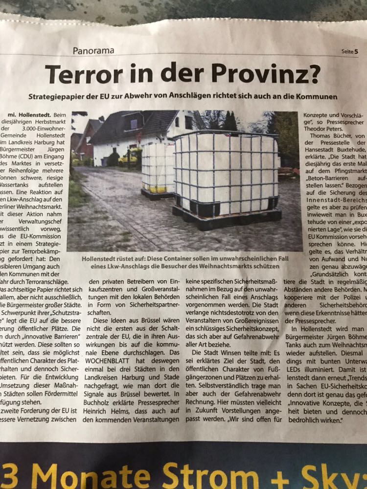 Was ist eine kommunale Sicherheitspartnerschaft ? Auch die EU will in einem Strategiepapier gegen Terrorbekämpfung in den Städten und Gemeinden höhere Sicherheitsstandarts verlangen. Poller bei Festen? Hollenstedt im Landkreis Harburg mit 3000 Einwohnern ist ein erstes Beispiel. Wenn schon Terrorbekämpfung in einem 3000 Seelendorf beim Herbstfest Anwendung findet, was bedeutet das eigentlich für das gesamte Sicherheits