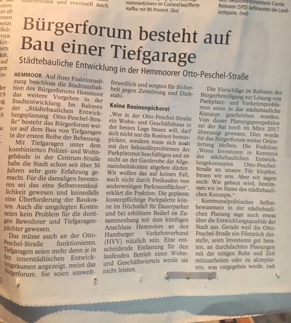 Mitten im Zentrum von Hemmoor in der Zentrumstraße, soll ein hochmoderner Wohnkomplex mit 10 neuen Wohnungen entstehen. Ohne Diskussion von „Wenn und Aber“, wurde dieser moderne Wohnkomplex schon vor über einem Jahr von den einheimischen Investoren Dieter Tiedemann und Gerd Kronenberg, wie selbstverständlich mit Tiefgarage geplant. Im zuständigen Stadtentwicklungsausschuss mit viel Beifall zugestimmt. Ja und in der Otto-Peschel-Straße, 300 Meter weiter, die eigentliche Verlängerung dieser zentralen Achse, soll das nicht gehen?