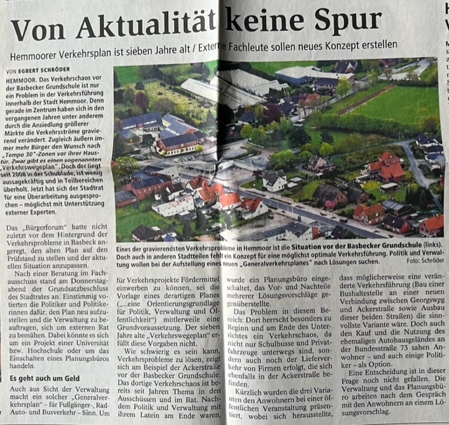 Hintergrund Grundschule Basbeck: Eine klasse Vorarbeit bezüglich der Verkehrssicherheit an unserer Grundschule Basbeck, hat der dortige Schulelternrat geleistet. Das unter Kinderbeteiligung entwickelte Konzept steht nun zur Beratung und Beschlussfassung an. Die NEZ titelte schon im Jahr 2015 zu den schwierigen Verkehrsverhältnissen an der GS Basbeck: „Von Aktualität keine Spur“. Was wird 2023 die NEZ für eine Schlagzeile setzen?
